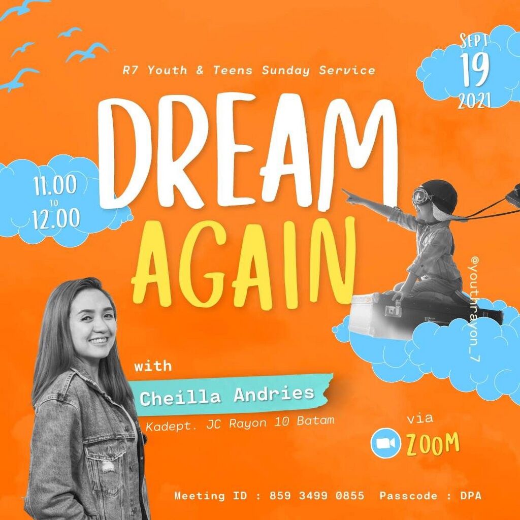 Youth and Teens Sunday Service bersama Cheilla Andries —KaDep JC Rayon 10 Batam diadakan pada hari Minggu, 19 September 2021 pukul 11:00-12:00 via Zoom #r7meet.