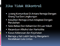 - Jika tidak terkontrol, maka akan terjadi suatu jurang pemisah antara orang tua dengan remaja, yang dapat memicu perilaku seks bebas, narkoba, tawuran, dan lain-lain.